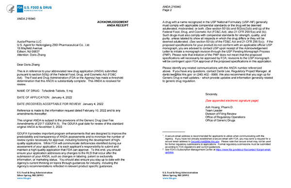 3月16日,珍寶島藥業(yè)發(fā)布公告,公司化藥仿制藥枸櫞酸托法替布片(規(guī)格:5mg)獲得美國(guó)食品藥物管理局(以下簡(jiǎn)稱(chēng)“FDA”)下發(fā)的《受理通知書(shū)》,待取得FDA注冊(cè)批件或上市許可批件后可進(jìn)行銷(xiāo)售。
