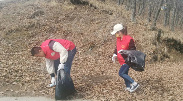 大家自備手套、水靴、剪刀、袋子、皮繩等清掃工具,從石青山的山腳下開始,對環(huán)山路兩側的垃圾進行全面清理、裝運。有的鉆入樹林,撿拾白色垃圾;有的摘除破損條幅,更換新貌;有的收堆、撐袋,將垃圾裝車運走。醒目的條幅標語,飄揚的志愿服務隊隊旗,鮮紅的志愿者身影,忙碌的勞動場面,構成了一幅五彩斑斕的畫卷。